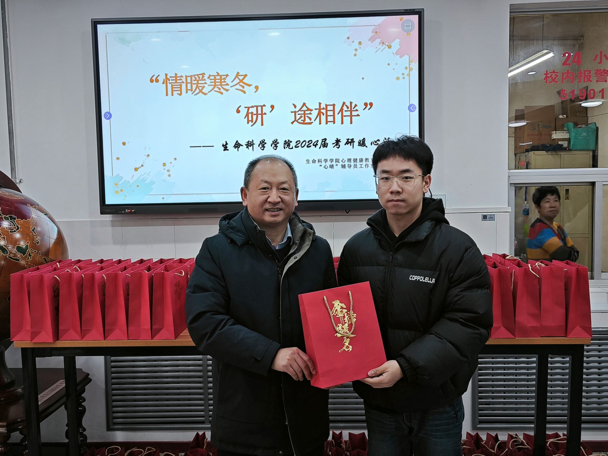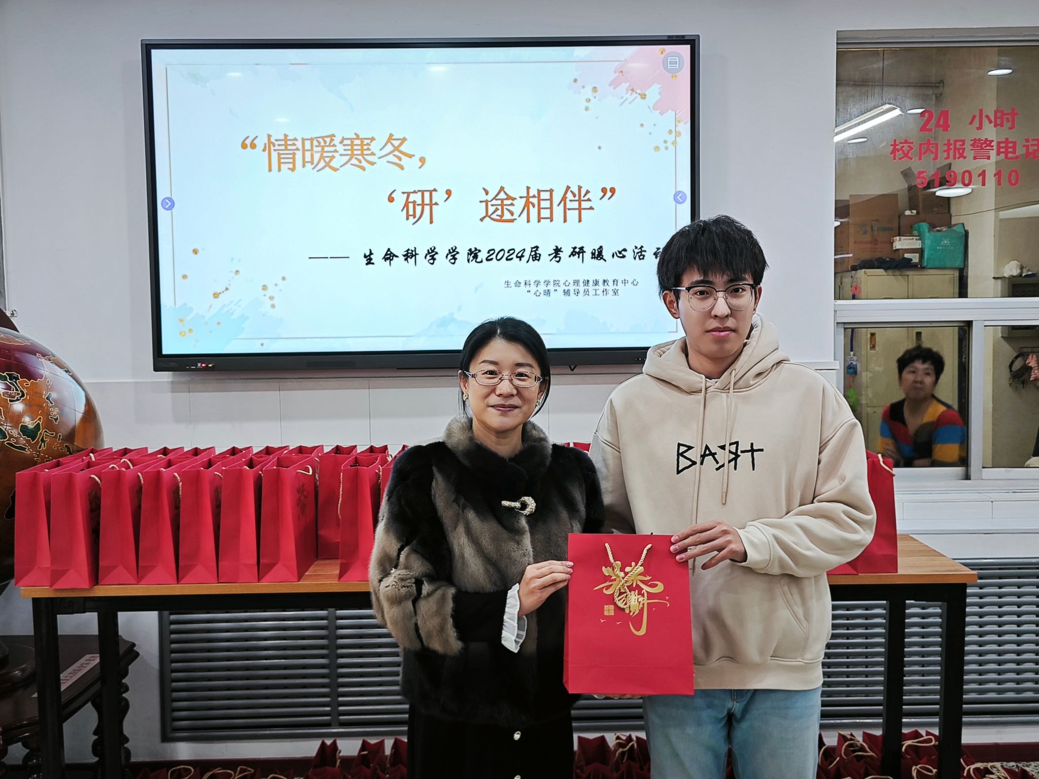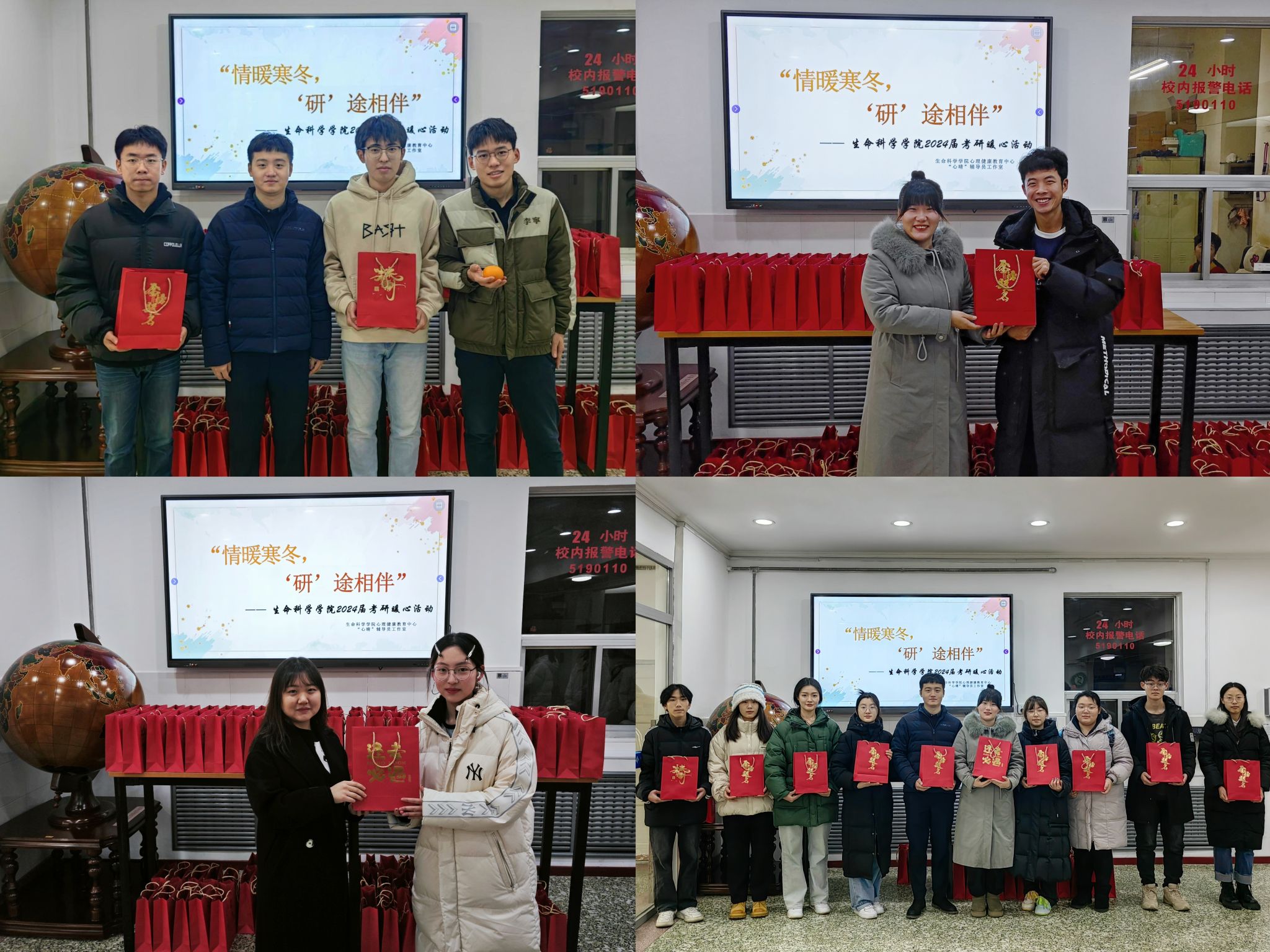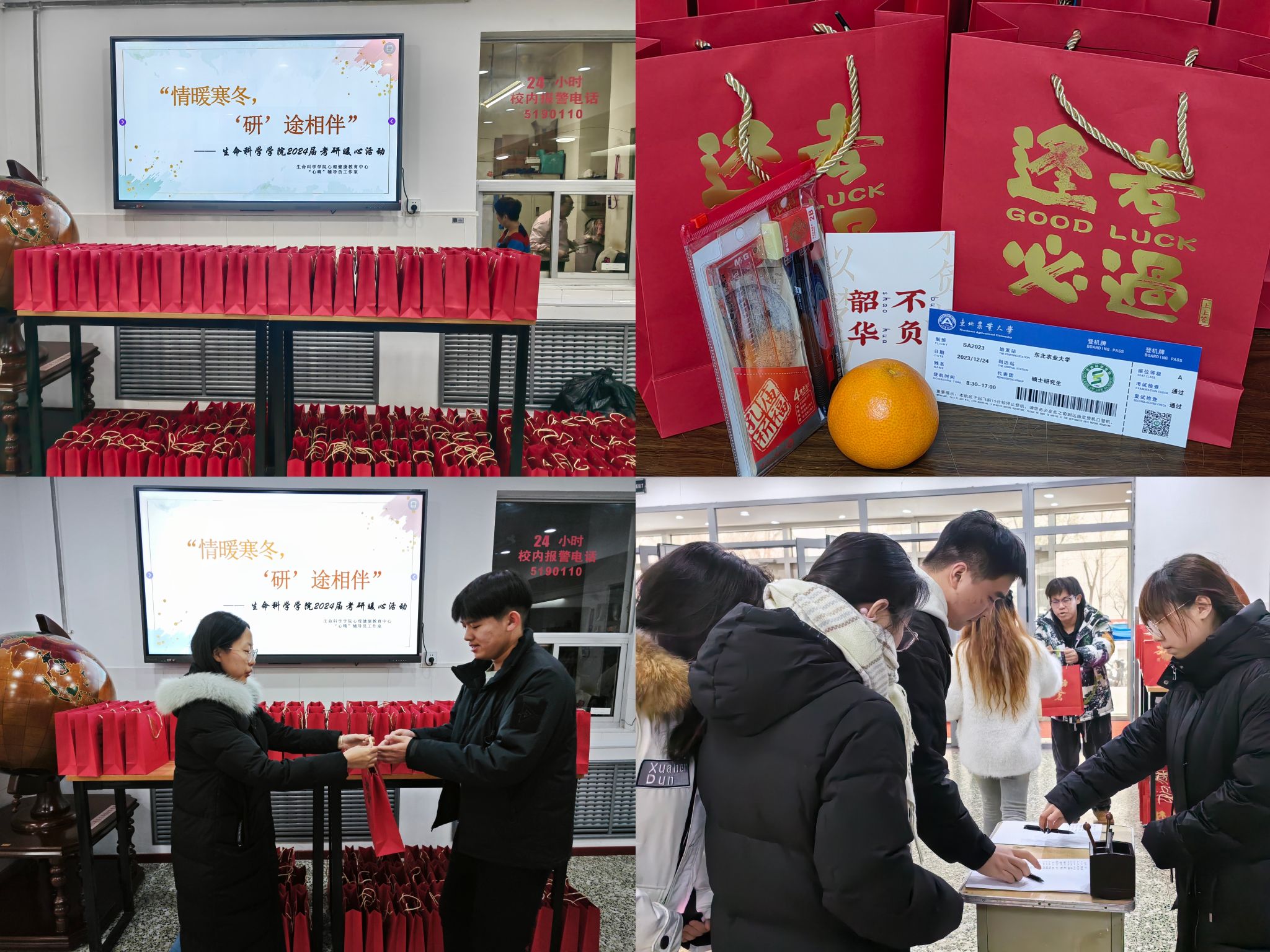 冬日有暖阳,“研”途有温情。为帮助2024届考研学子坚定备考信心,鼓舞士气,传递关爱与力量,近日,伟德国际victor1946组织开展“情暖寒冬‘研’途相伴”考研暖心助力活动。学院党委书记施喜军,副书记孙珠红,2024届本科毕业班辅导员韩宗伯、心理健康教育中心指导教师赵彩桐参加活动并为考研学子发放“考研暖心礼包”。学院领导和老师们与考研学子亲切交流并送上美好的祝福,激励同学们在考前最后冲刺阶段,调整好心态,提高学习效率,树立信心,劳逸结合,坚持到底,争取成功“上岸”。