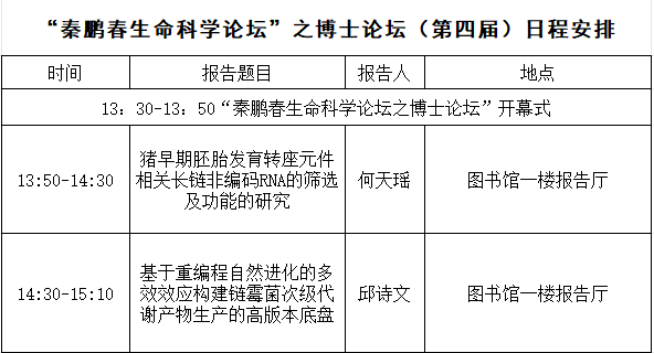 为了传承和发扬秦鹏春先生敢为人先的创新意识和锲而不舍的科研精神,进一步推动我院研究生学风建设,发挥优秀研究生榜样力量,营造良好、浓厚的学术氛围,提高我院研究生培养质量,伟德国际victor1946拟于2024年6月13日举办“秦鹏春生命科学论坛”之博士论坛(第四届)。报告人为经各二学科推荐和学院选拔的2024届优秀博士毕业生。论坛以学术会议形式,采取线下方式进行。