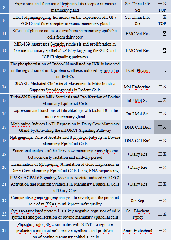 Zhou J, Jiang M, Shi Y, Song S, Hou X, Lin Y*. Prolactin regulates LAT1 expression via STAT5 (signal transducer and activator of transcription 5) signaling in mammary epithelial cells of dairy cows. J Dairy Sci. 2020 Jul;103(7):6627-6634.