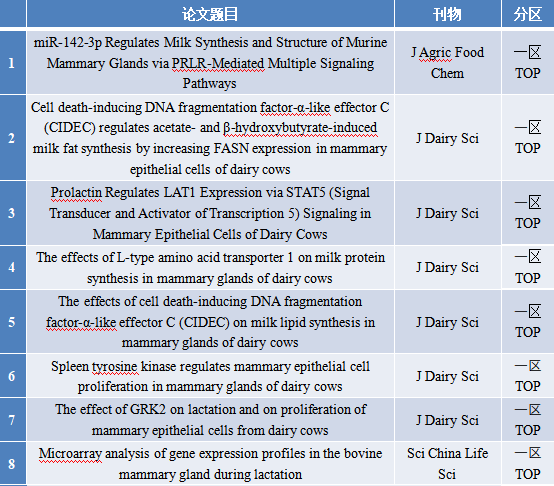 (1) Tian, Lei; Zhang, Li; Cui, Yingjun; Li, Huiming; Xie, Xuejiao; Li, Ye ;*; Wang, Chunmei * miR-142-3p Regulates Milk Synthesis and Structure of Murine, Mammary Glands via PRLR-Mediated Multiple Signaling Pathways Journal of , : 9532-9542. Agricultural and Food Chemistry 2019 67(34)