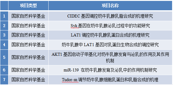 (1). 国家自然科学基金面上项目:31671285,CIDEC基因调控奶牛乳腺乳脂合成的机理研究,2017. 01至2020. 12,60万元,参加。