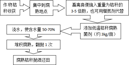 在玉米收获后,秸秆不需粉碎处理,对秸秆进行搂草,打包后,集中在田边地头,最好有水源,交通方便的地方,进行秸秆腐熟。作物面积与秸秆腐熟堆的面积比为1000:1,即1000亩的作物秸秆,需要占地面积为1亩地的空间。采用“三明治”模式进行秸秆腐熟,即:一铺,铺上秸秆(30-50cm厚);两撒,撒上固体秸秆腐熟菌剂和动物粪便(或者增氮剂);两喷:喷上液体秸秆腐熟菌和水;层层叠加;调节水分至50-70%,腐熟过程中适当补水和动物粪尿汤,中间翻抛1次,发酵100天左右,即可腐熟成肥,获得的有机肥可以直接抛撒还田。腐熟后的秸秆呈纤维状,抛撒即碎。