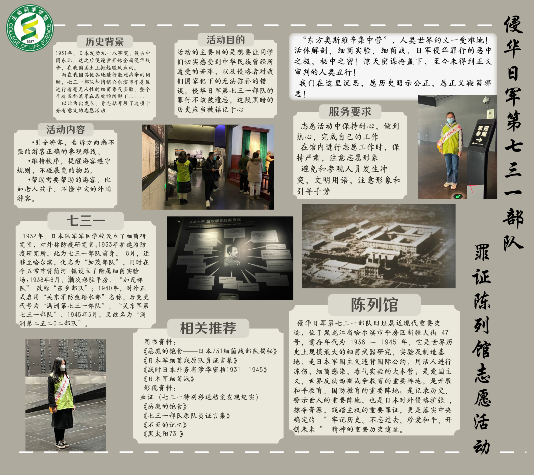 三月,充满朝气的季节,而这朝气却被万物谱写。在春天里,小草探出头儿要张望世界,默默地为大地披上了绿装;树木的嫩芽儿也不甘示弱,争先恐后地冒出来,向世间问好;一切的一切,都有着崭新的面貌。三月的风儿瞬间向我们吹来,带着雨露和清香,也带来了一个名字——雷锋。2023年是学习雷锋第六十年,为贯彻落实习近平总书记的重要指示,由校团委主办、校青年志愿者协会承办的“雷锋精神我传承,青春闪耀新时代”主题志愿服务展览于2023年3月31日在主楼甬道顺利展开。在此期间,伟德国际victor1946青志站圆满完成了“侵华日军第七三一部队罪证陈列馆巡导”志愿活动的讲解。此次活动在学生中引发了热烈反响,不仅让中外学生体会到了“雷锋精神”,也进一步使更多人了解抗战时期侵华日军犯下的严重罪行、中国共产党在世界反法西斯战争胜利的牺牲与不可磨灭伟大历史贡献。