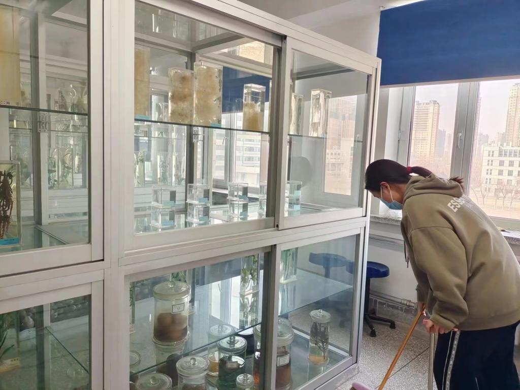 志愿者们热情高涨,干劲十足,积极投身清扫工作中。他们挥舞着扫帚对标本馆的地面进行清扫,清理柜子上的积灰,擦拭柜子、玻璃。