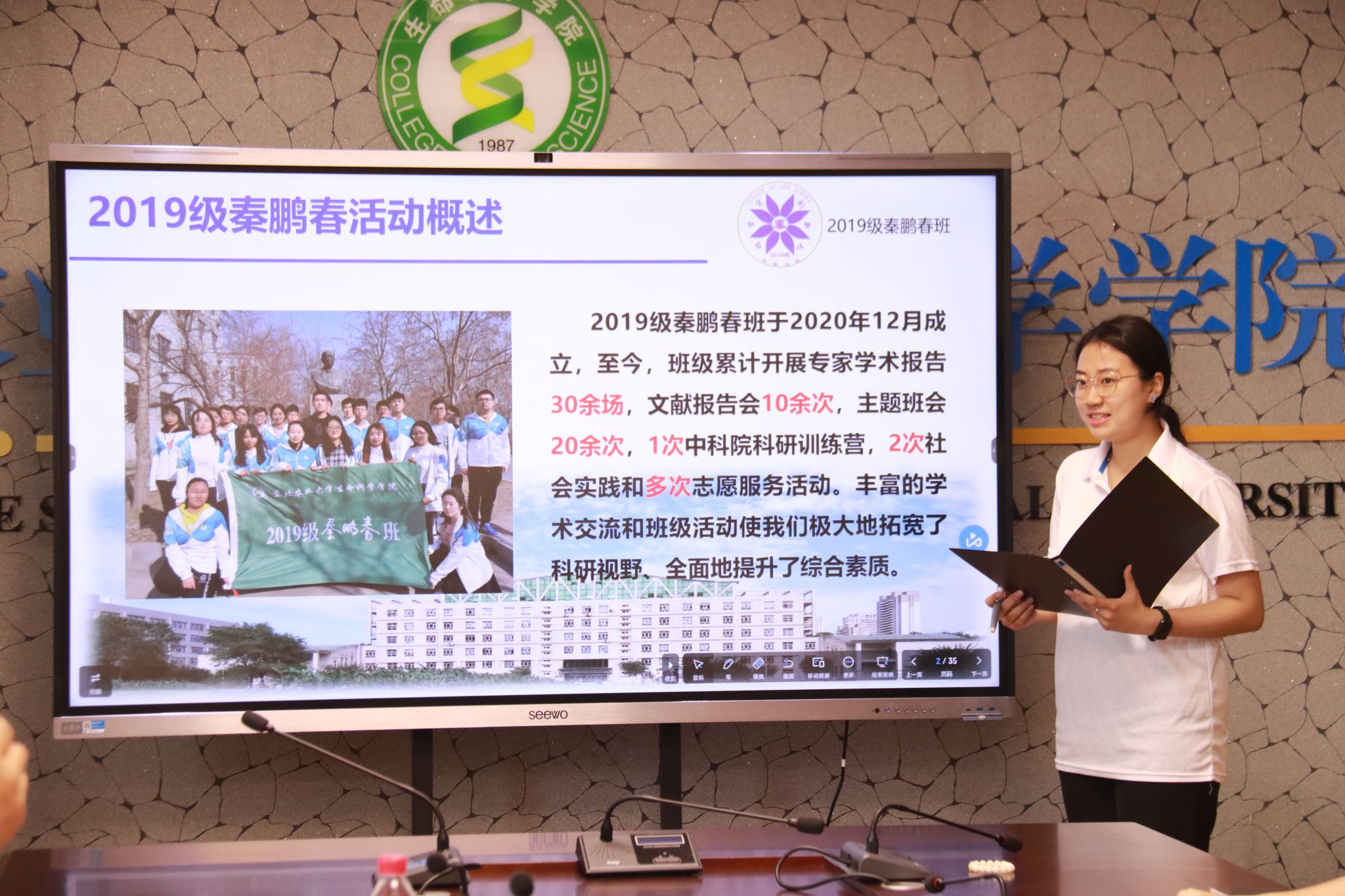 座谈会上,2019级秦鹏春班团支书程琬婷汇报班级建设情况。班级自2020年12月组建以来,在加强思想引领、拓宽学术视野、提升综合素质等方面开展大量工作。班级开展专家学术报告30余场,文献报告会10余次,主题班会20余次,1次中科院暑期科研训练营及多次社会实践和志愿服务活动。班级共30人,其中中共党员占比86.7%。29人升学至中国科学院、清华大学、中山大学、南京大学等国内知名高校院所继续深造,大学英语六级通过率97%,参与发表文章共18篇,单篇影响因子最高达到20.577,以第一作者发表的SCI文章3篇,累计获得国家级奖项40余项、省级奖项40余项。