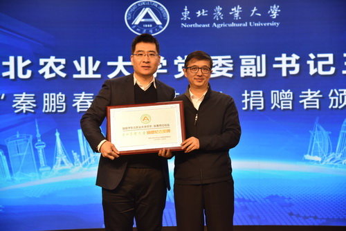 校党委副书记王泽方为秦鹏春教育基金捐赠校友代表邓宇颁发捐赠证书