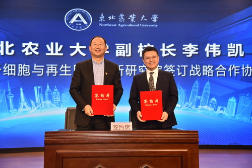 副校长李伟凯与胡宝洋研究员分别代表我校与北京干细胞与再生医学创新研究院签署战略合作协议书