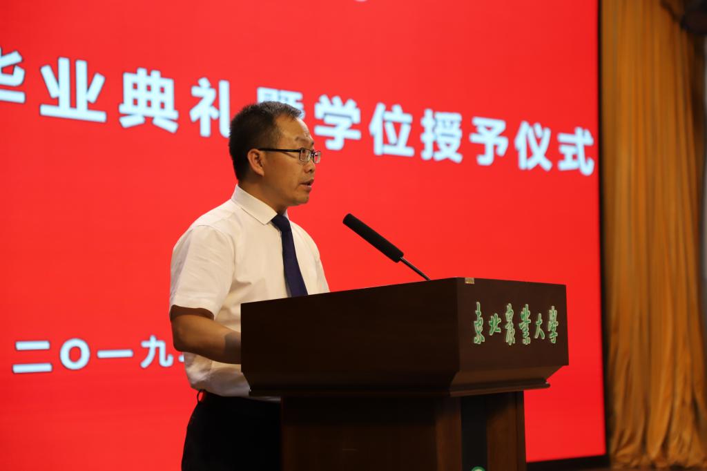 院长栾非时教授为毕业典礼致词。她代表学院向顺利完成学业即将奔赴工作岗位或继续深造的学生表示最热烈的祝贺,向辛勤培养他们成长成才的全体老师表示崇高的敬意,向始终关心支持学生成长成才的各位家长、亲友和校友表示最衷心的感谢!她还与毕业生同学分享了三点人生感悟:一是要志存高远,牢固确立自己的人生奋斗目标。二是要终生学习,不断提升自己的核心竞争能力。三是要不忘初心,永远牢记自己的责任和使命。希望同学们能秉承“博观约取、厚积薄发”的院训,打亮“追求卓越,勇于创新”的底色;传承弘扬“艰苦奋斗、自强不息”的东农精神,在未来人生道路上大展宏图。