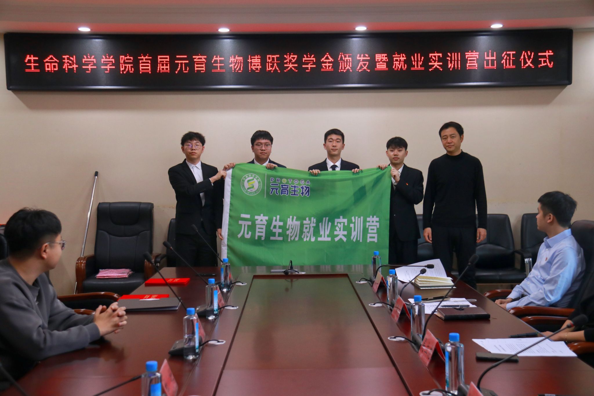 吴立龙为首届元育生物就业实训营营员授予队旗和队服,勉励同学们拓宽专业视野,提高就业能力,尽快成长为企业所需的优秀人才。