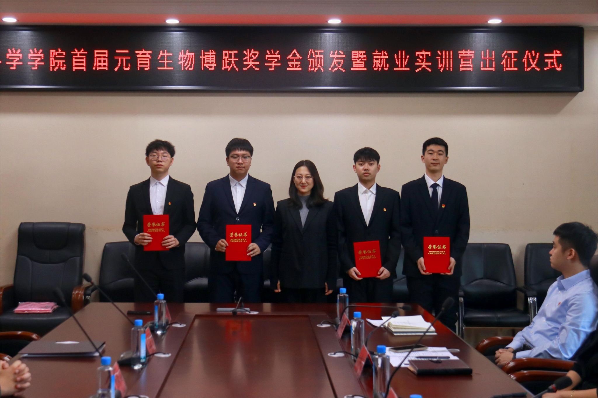 1月5日下午,伟德国际victor1946首届“元育生物博跃奖学金”颁发暨就业实训营出征仪式在610会议室举行,招生就业处副处长吴立龙、学生工作部副部长刘钊熠、伟德国际victor1946党委副书记孙珠红、学生工作办公室主任朱睿、全体本科生辅导员和获奖学生参加活动。活动由朱睿主持。