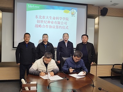 在创世纪种业有限公司开展座谈会。公司总裁黄涛,总监王玉辉,生物技术中心主任、校友崔洪志参加座谈。黄涛对施喜军一行的到访表示热烈欢迎,并详细介绍了创世纪种业有限公司的发展历程和业务板块。崔洪志介绍了公司生物育种技术研发情况和未来合作意向。施喜军向企业介绍了学院学科建设、人才培养和科学研究情况,并表示希望通过本次交流能够搭建更加科学、完善、高水平的专业学位研究生联合培养平台,共同探讨生物学科发展,进一步拓展在生物育种研究上的合作。会上,双方达成合作意向并签署了《校企战略合作框架协议》。