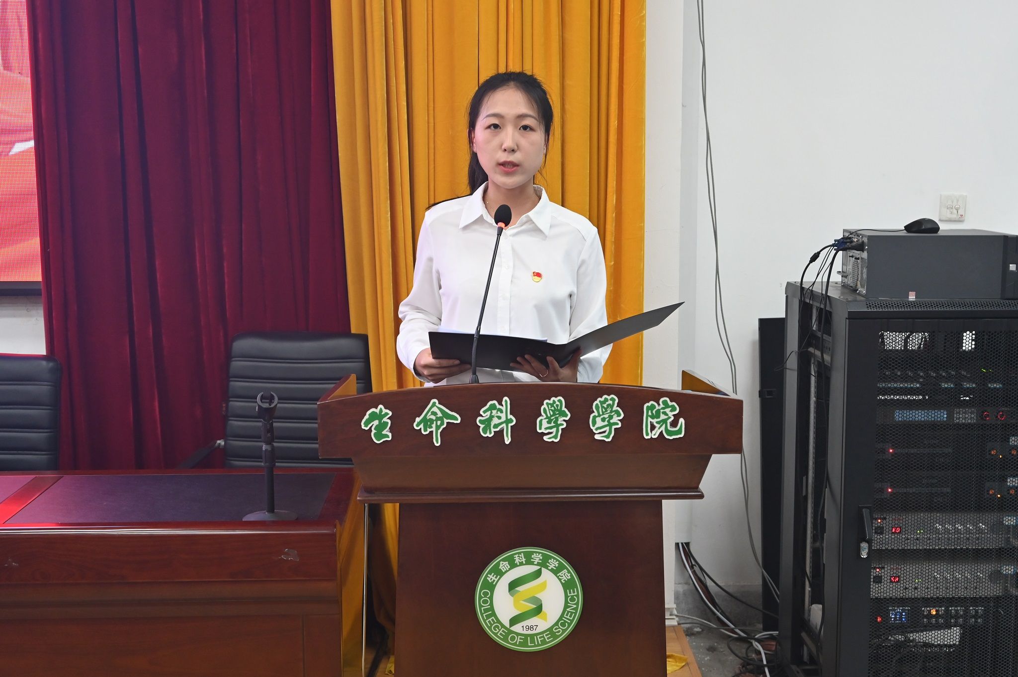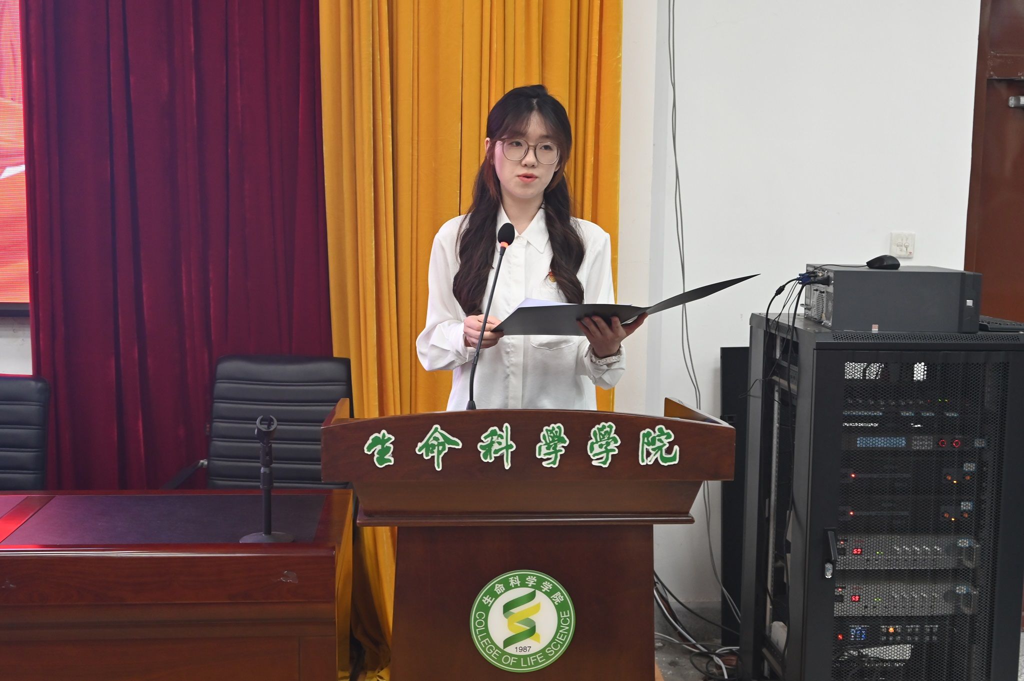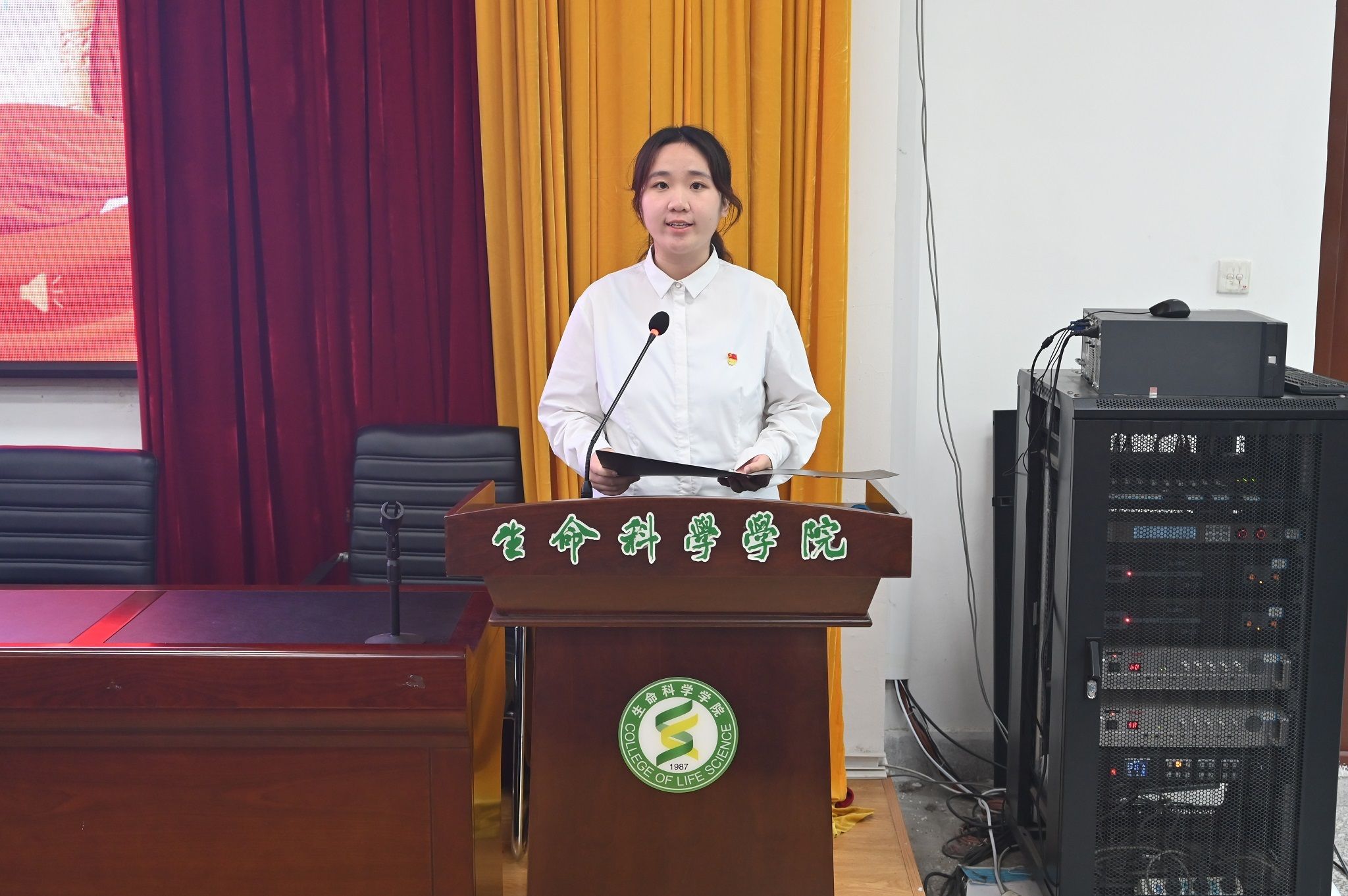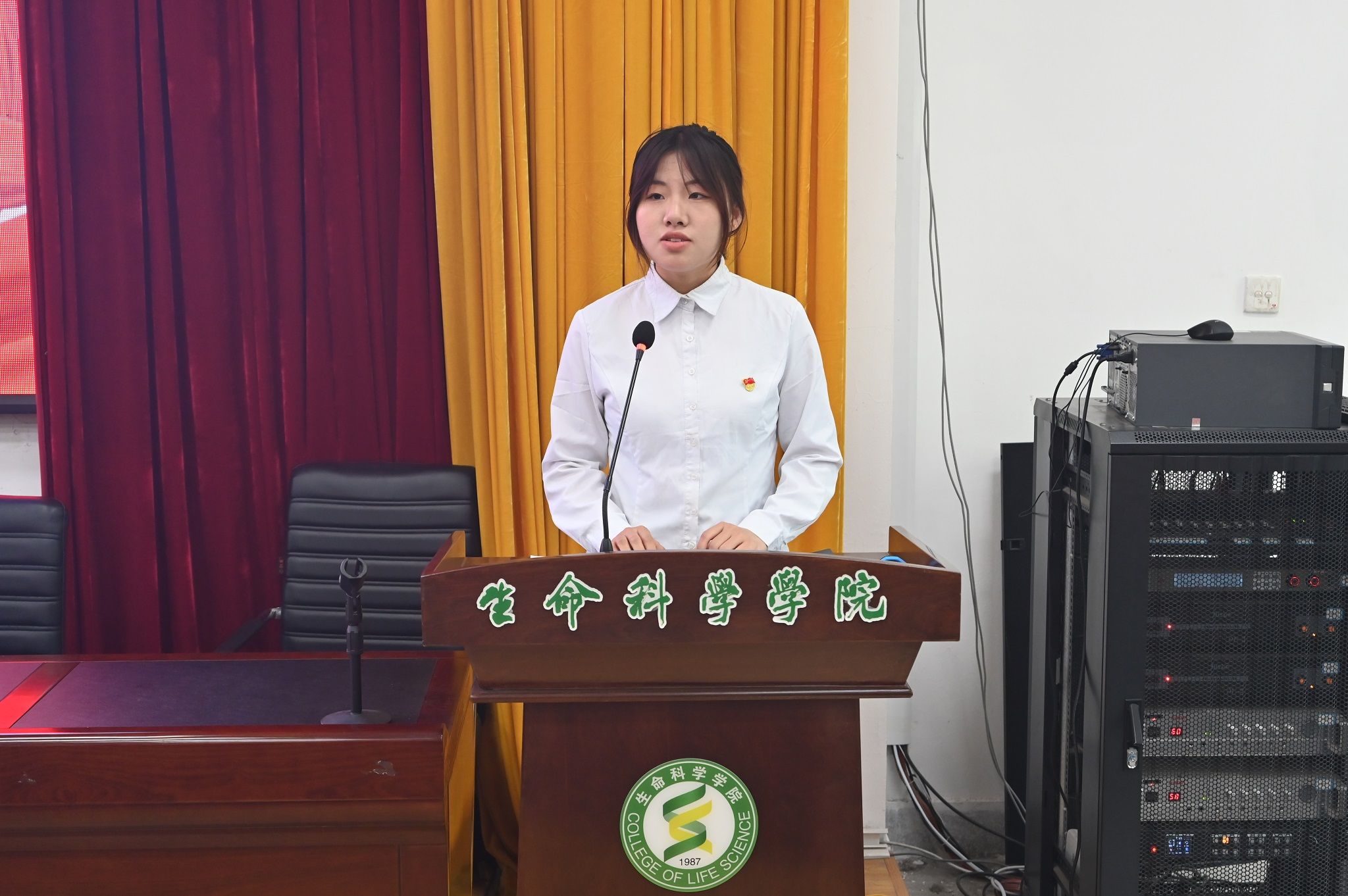 新党员代表、生科2281班范学嘉表示,在鲜红的党旗下庄严宣誓,令人热血沸腾、心潮澎湃。她代表新发展党员向党组织郑重承诺:努力做到坚定理想信念,永葆政治本色;提高综合能力,练就过硬本领;立足时代使命,创先争优做表率。