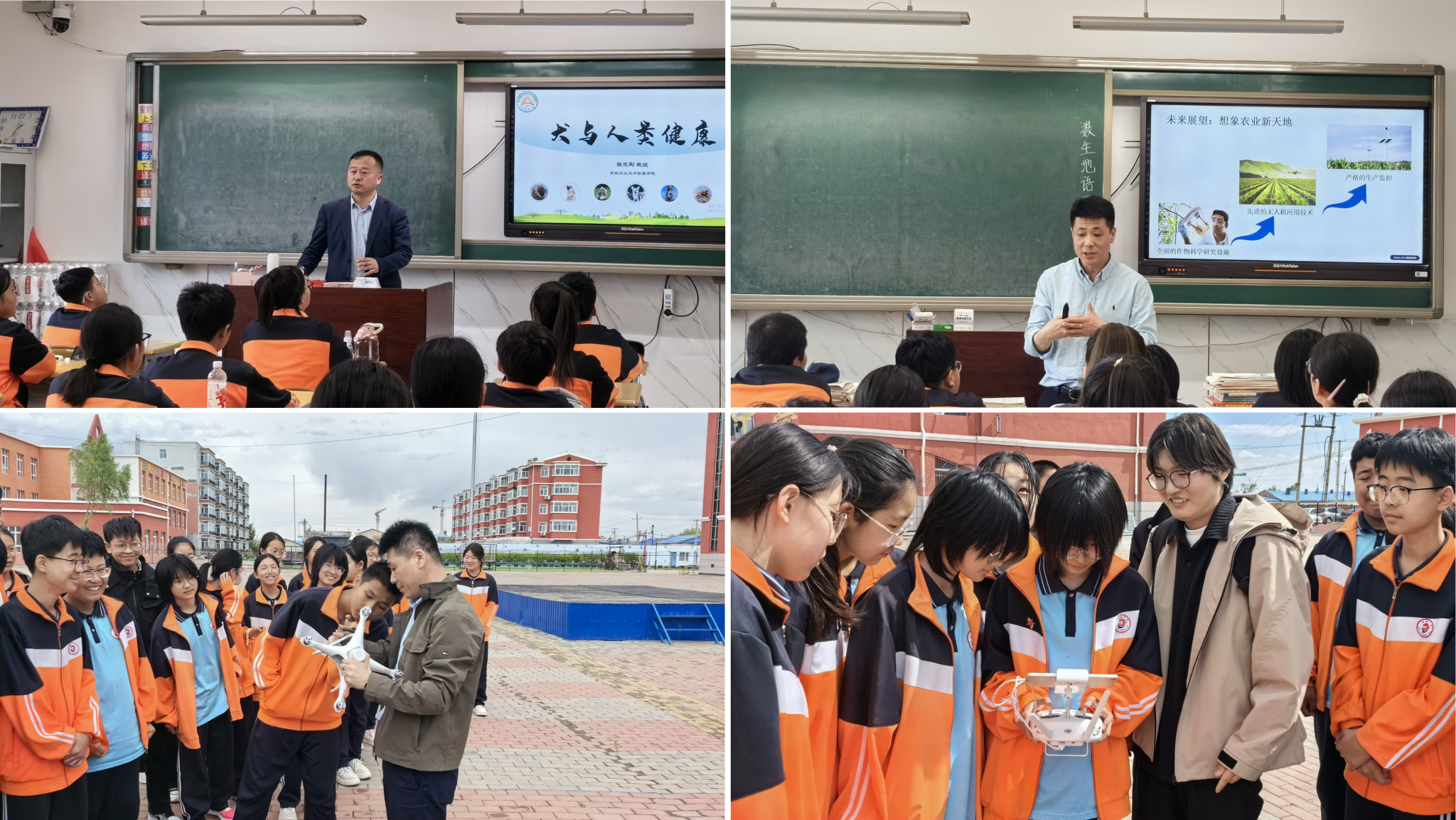 在花园镇中学八年三班的课堂,国家重大人才工程青年学者张志刚以《犬与人类健康》为题,从犬对人类的益处、人犬共患疾病预防、犬种的多样性等角度为学生们讲授了一堂生动的科普课程。课堂气氛活跃,学生们认真听讲、积极互动,授课得到了听课师生们的一致好评。在八年二班,谭克竹以《农业监测新方式——多光谱成像无人机让植物生长尽在掌握》为题,从传统农业监测、人工智能在农业中的应用、多光谱成像无人机等角度为学生讲授了农业监测领域的前沿科技知识。在室外实操环节,学生们在老师的指导下第一次完成了无人机对农田的扫描,极大激发了中学生对科学研究的热情,锻炼了实践动手能力。